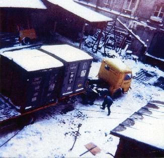 9- Il fait froid en cet hiver 62 à Paris. Le tracteur FAR type HE 85 de 1957, malgré son blocage de différentiel glisse sur les pavés et pose des difficultés pour s’atteler à la remorque Lagache et Glazmann sur laquelle sont chargés 2 cadres CNC de 8 et 12 m3.