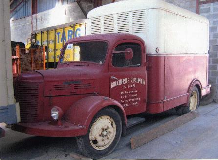 11- Ce petit camion HOTCHKISS Type PL25 date de 1952. Le fourgon a été réalisé par le carrossier POURTOUT. A l’avant un bac à glace hydrique accessible par porte latérale à droite apportait un petit peu de fraîcheur à la viande pendue chargée dans le fourgon. L’air entrant par les ouies pratiquées dans la face avant au-dessus de la cabine. Les Boucheries PAUPELIN qui possédaient 3 magasins dans Paris assuraient elles-mêmes leurs transports entre les abattoirs de La Villette et leurs magasins. On notera une nette évolution par rapport aux plateaux ridelles FORD d’Alamassé. Ce véhicule a été heureusement sauvegardé.