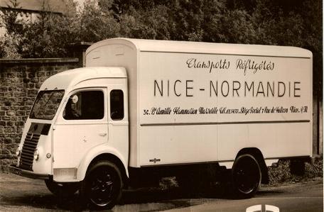 2- Fourgon intégral sur châssis 2 essieux LATIL. Le véhicule carrossé en fourgon intégral par le carrossier AUGEREAU est un 09 tonnes utiles. La photo a été prise alors qu’il vient d’être immatriculé en 1949. Il représente l’avenir du transport sous température dirigée. Bien que le groupe de production de froid ne soit pas installé, son emplacement est prévu au dessus du poste de conduite. A l’avant gauche on distingue les lettres TD (toutes distances) cela signifie que ce camion qui portera le n°77 chez Alamassé est destiné aux premières liaisons inter-centres par la route.