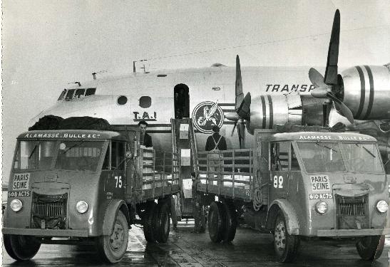 3- Fin des années 40 début des années 50. Ces deux FORD construits à Poissy par Ford France sont typiques des véhicules de camionnage à Paris en cette moitié du 20° siècle. Ils chargent du frêt parvenu par avion probablement à l’aéroport du Bourget. Il s’agit d’une marchandise à forte valeur ajoutée et sans doute très périssable. Qu’importe elle sera transportée sur ces plateaux à ciel ouvert. Si le temps est menaçant les chauffeurs dérouleront la bâche placée sur la cabine. On remarquera également les chables de chaque côté utilisés pour maintenir des chargements en hauteur ou des fûts. Après un court trajet les cartons auront atteint leur destination finale (entrepôt frigorifique ou importateur aux halles centrales).
